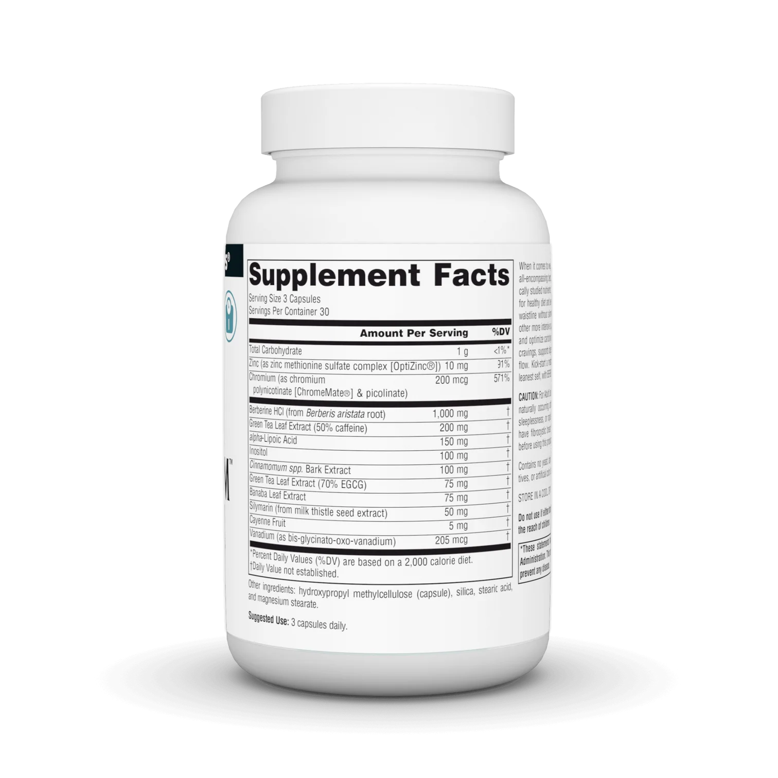 Zinc (as zinc methionine sulfate complex [OptiZinc®]), Chromium (as chromium polynicotinate [ChromeMate®] & picolinate), Berberine HCl (from Berberis aristata root), Green Tea Leaf Extract (50% caffeine), alpha-Lipoic Acid, Inositol, Cinnamomum spp. Bark Extract, Green Tea Leaf Extract (70% EGCG), Banaba Leaf Extract, Silymarin (from milk thistle seed extract), Cayenne Fruit, Vanadium (as bis-glycinato-oxo-vanadium)